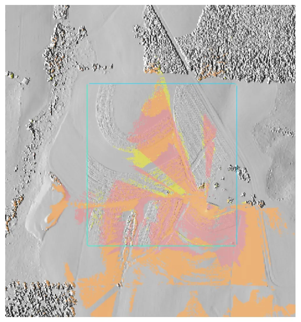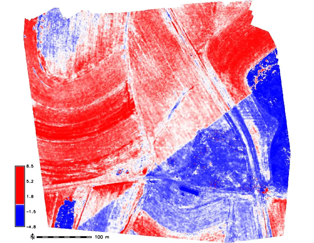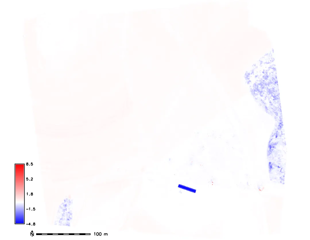 - Hist. equalized color ramp for differences highlights a small shift in lidar swath